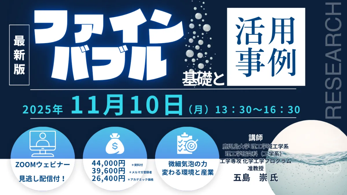 株式会社シーエムシー・リサーチが主催するオンラインセミナー「ファインバブルの基礎と活用事例」が、2025年11月10日(月)に開催されます。講師は、鹿児島大学理工学域工学系の准教授である五島崇氏です。このセミナーでは、ファインバブル技術の基本を理解し、その応用事例について詳しく学ぶことができるテーマに沿って進行します。