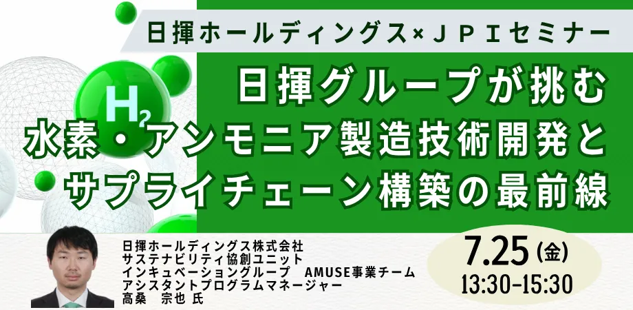 2025年7月25日、JPI(日本計画研究所)は、日揮ホールディングスの高桑宗也氏を迎え、水素とアンモニアの製造技術に関するセミナーを行います。このセミナーでは、クリーンエネルギーの一翼を担う水素とその誘導体であるアンモニアの重要性についてお話しされます。