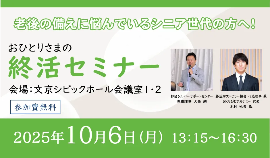 2025年10月6日(月)、文京シビックホールで「おひとりさまの終活セミナー」が開催されます。このイベントは、おひとりさまの皆さんが自身の人生の終わりをどのように迎えたいかを考える貴重な機会です。最近では、終活が重要視されるようになってきましたが、特におひとりさまにとっては、相続や認知症対策、介護、葬儀、死後の手続きなど不安に思うことが多いのではないでしょうか。