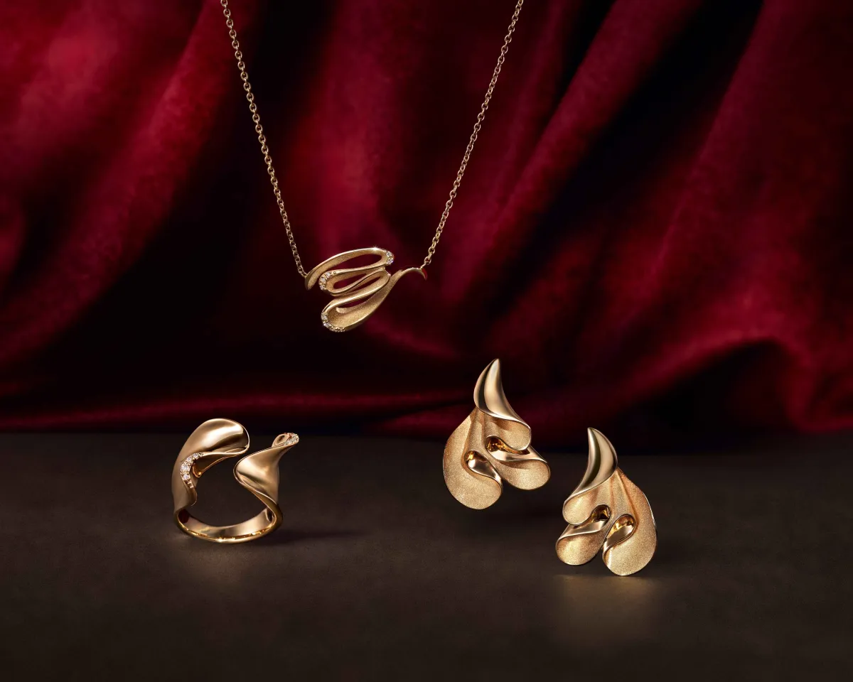 今回のジュエリー展では、ヴェルディのオペラ『サイモン・ボッカネグラ』の舞台セットをデザインソースにしたコレクションも特筆すべきポイントです。このコレクションでは、たっぷりとした布のドレープ、ジェノヴァの海、登場人物の心情の変化、そして光の動きがゴールドでドラマティックに表現されています。
