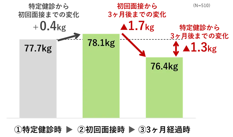 実際のデータ分析では、初回面接実施までの平均日数が202日となり、特定健診の数値から変動している場合が多いことも確認されました。特に、特定健診後に体重が平均して0.4kg増加していることも興味深いポイントです。