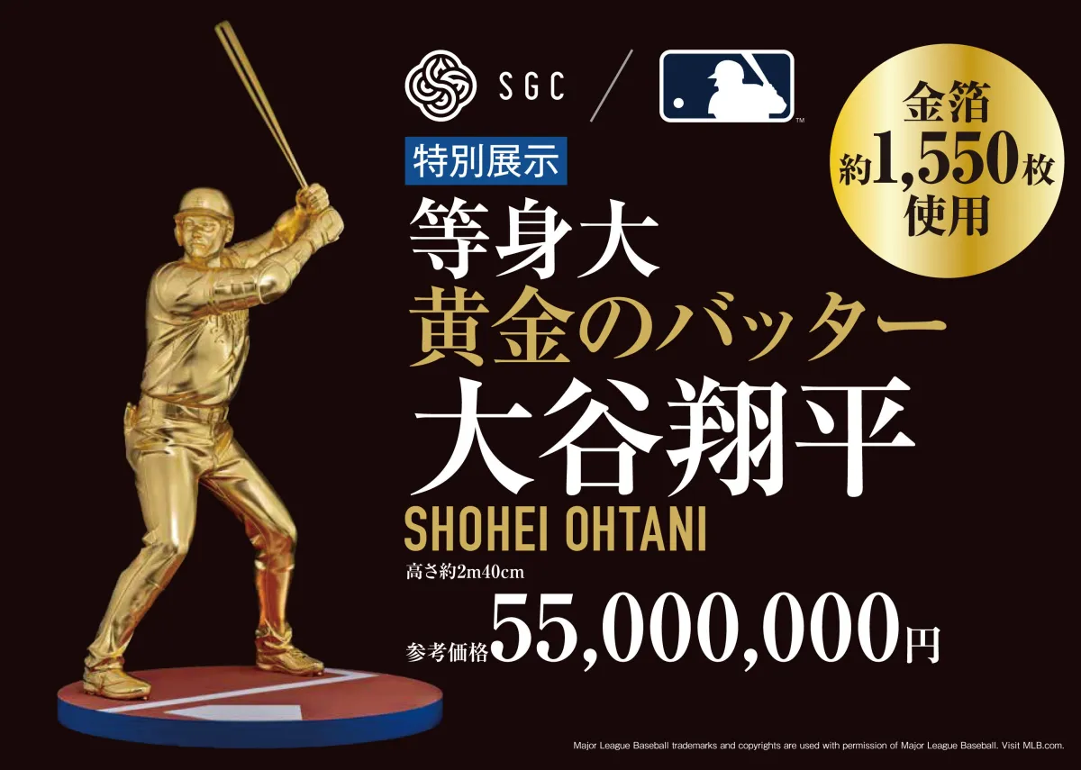 この黄金像は、金製品の製造・販売を行う株式会社SGCが手掛け、選手公認のもとに製作されたものです。使用された金箔の枚数はなんと1,550枚。高さは約1.9mで、大谷選手の身長にぴったり合わせたサイズとなっています。参考価格は5,500万円で、2024年に大谷選手が記録した50-50達成を記念したものです。