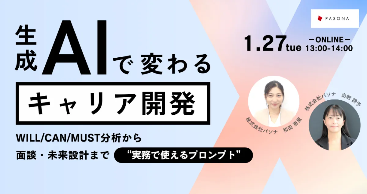 2026年1月27日、株式会社パソナが主催するウェビナー「生成AIで変わるキャリア開発 ― WILL/CAN/MUST分析から面談・未来設計まで “実務で使えるプロンプト”」がオンラインで開催されます。このセミナーは、企業の人事部門や管理職層の方々を対象に、生成AIを活用したキャリア開発の実務的な手法を学ぶ貴重な機会です。