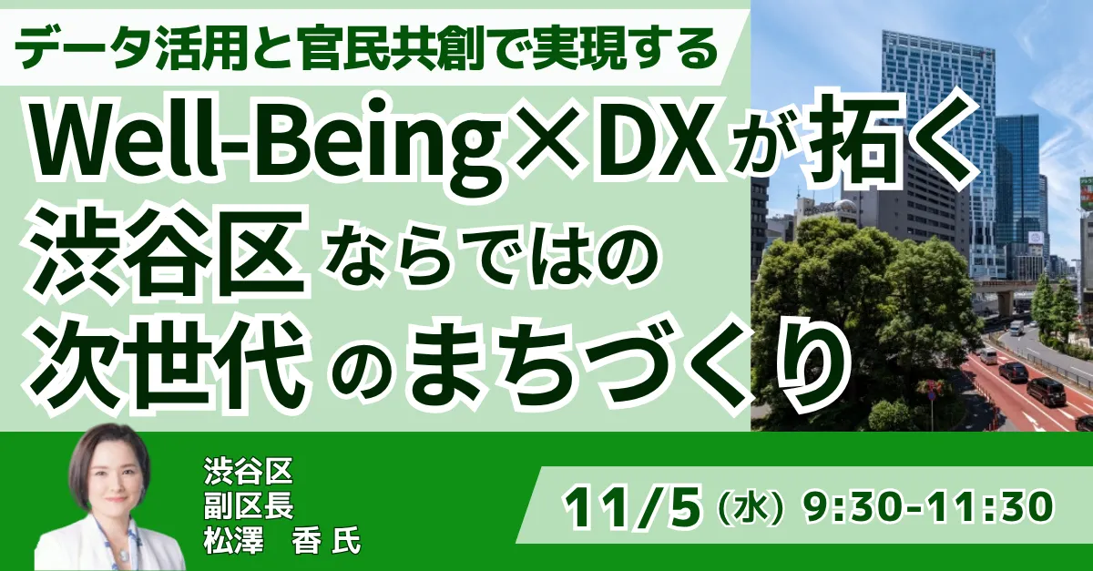 11月5日(水)、渋谷区で開催されるセミナー「Well-Being×DXが拓く渋谷区ならではの次世代のまちづくり」では、渋谷区の副区長、松澤香氏を迎え、地域の次世代のまちづくりに向けたさまざまな施策が具体的に議論されます。このイベントは、地域のウェルビーイングとデジタルトランスフォーメーション(DX)の融合による、未来の渋谷を形作る貴重な機会となることでしょう。