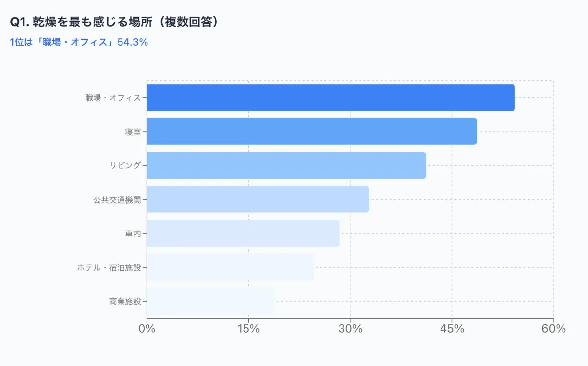調査結果では、乾燥を最も強く感じる場所として「職場・オフィス」が54.3%で第1位。次いで「寝室」が48.7%、そして「リビング」が41.2%という結果が出ました。公共交通機関や車内でも一定の乾燥を感じている人が多いことも分かりました。