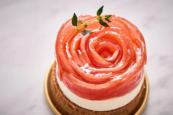 まずご紹介するのは、りんごのガトーです。販売期間は11月1日から30日までで、旬のりんごを赤ワインで丁寧に煮込んだコンポートを使用。これにほのかな風味のクリームチーズと、スモモの一種・ミラベルのゼリーが入った、甘美な一口を楽しむことができます。美しく色付いたりんごは、バラのように飾られており、目にも美味しい一品に仕上がっています。