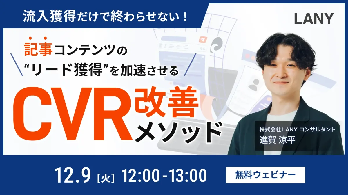 デジタルマーケティング支援を行う株式会社LANYが、2025年12月9日(火)に無料ウェビナー「流入獲得だけで終わらせない!記事コンテンツのリード獲得を加速させるCVR改善メソッド」を開催します。ウェビナーでは、記事コンテンツの流入はあるものの、リード獲得の成果が出ないというお悩みを抱える方々に向けて、CVR(コンバージョン率)改善の具体的な手法を紹介します。