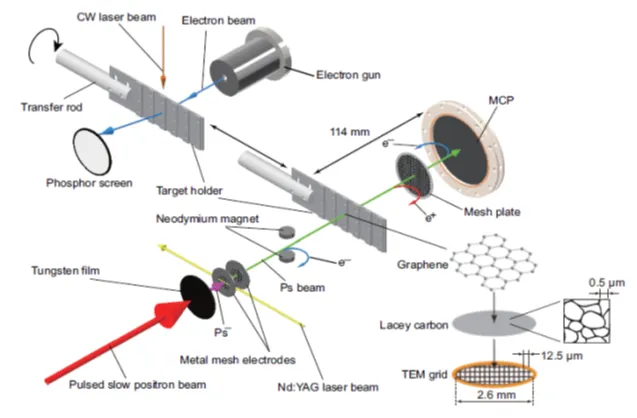 今回の実験では、ポジトロニウムビームを2.3keVおよび3.3keVのエネルギーに設定し、2原子層のグラフェン薄膜に入射させました。このグラフェン薄膜は非常に強靭で薄い炭素で構成され、電子ビームの回折を利用することで、ポジトロニウムの回折現象を観測することが可能になりました。