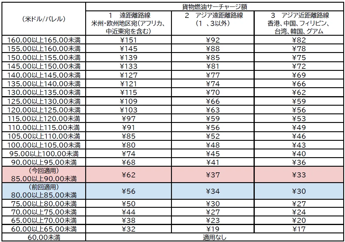 申請によると、2025年9月のジェット燃料平均価格は1バレルあたり86.94米ドルとなり、この基準に基づく燃油指標価格は「85.00以上90.00未満」と設定されています。この価格帯に応じて、国際貨物の燃油サーチャージ額は以下のようになります: