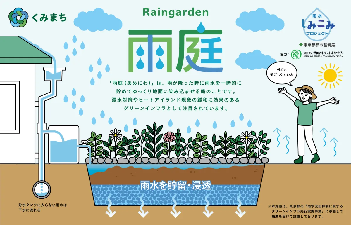 雨庭は、降雨によって発生する雨水を一時的に貯留し、地中に浸透させることで水害を抑制するための庭のスタイルです。植栽帯を中心に構成され、その機能は都市型水害の軽減だけでなく、植物の健康的な育成や昆虫、小動物の生息環境の提供に寄与します。さらに、雨水が土壌を通過する際に自然にろ過されるため、水質の浄化にも役立ちます。このように、雨庭は環境負荷の軽減と防災効果を同時に満たすことができる、都市にとって重要な施策となっています。