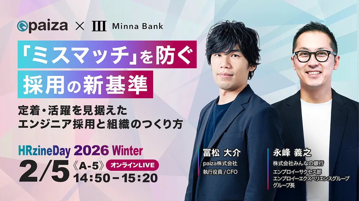 2026年2月5日(木)、オンラインイベント「HRzine Day 2026 Winter」に、ITエンジニア向けの成長プラットフォームを運営するpaiza株式会社が登壇します。近年、ITエンジニアの不足が深刻化し、多くの企業が人材確保に苦慮しています。本イベントでは、採用におけるミスマッチや早期離職といった課題を掘り下げ、新たな採用基準を探ります。