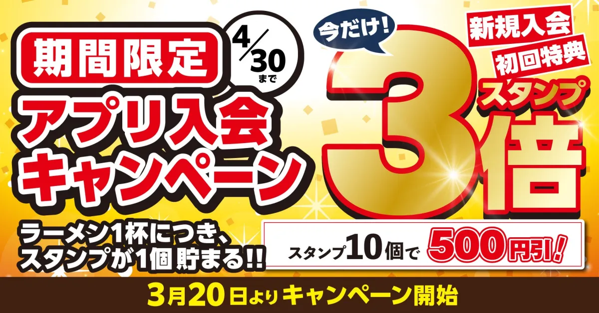 「熟成醤油ラーメン 肉そば」で人気の『丸源ラーメン』が、2026年3月20日から新規アプリ会員向けの特別キャンペーンを実施します。これは、ラーメン好きにはたまらないチャンスとなるでしょう。アプリに新しく登録した方に初回特典として、なんとスタンプが3倍付与される特典が用意されています。通常はラーメン1杯につき1スタンプが付与されるところ、この期間中は1杯で3スタンプが貯まります。