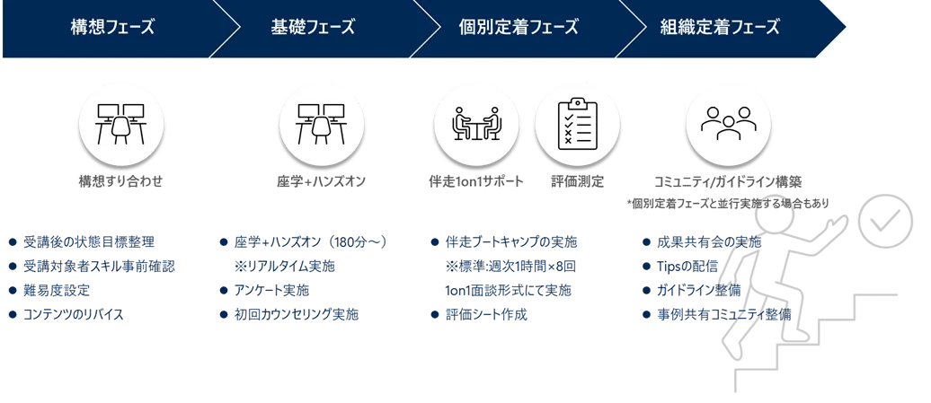 研修内容は次の4つのフェーズで実施されます。まずは構想フェーズで目標設定や現在のスキルを確認し、次に基礎フェーズでAIエージェントの基礎知識と操作を学び、個別定着フェーズでは専門家による1on1支援が行われます。最後に、組織定着フェーズではナレッジを他部門に展開するための仕組み作りをサポートします。