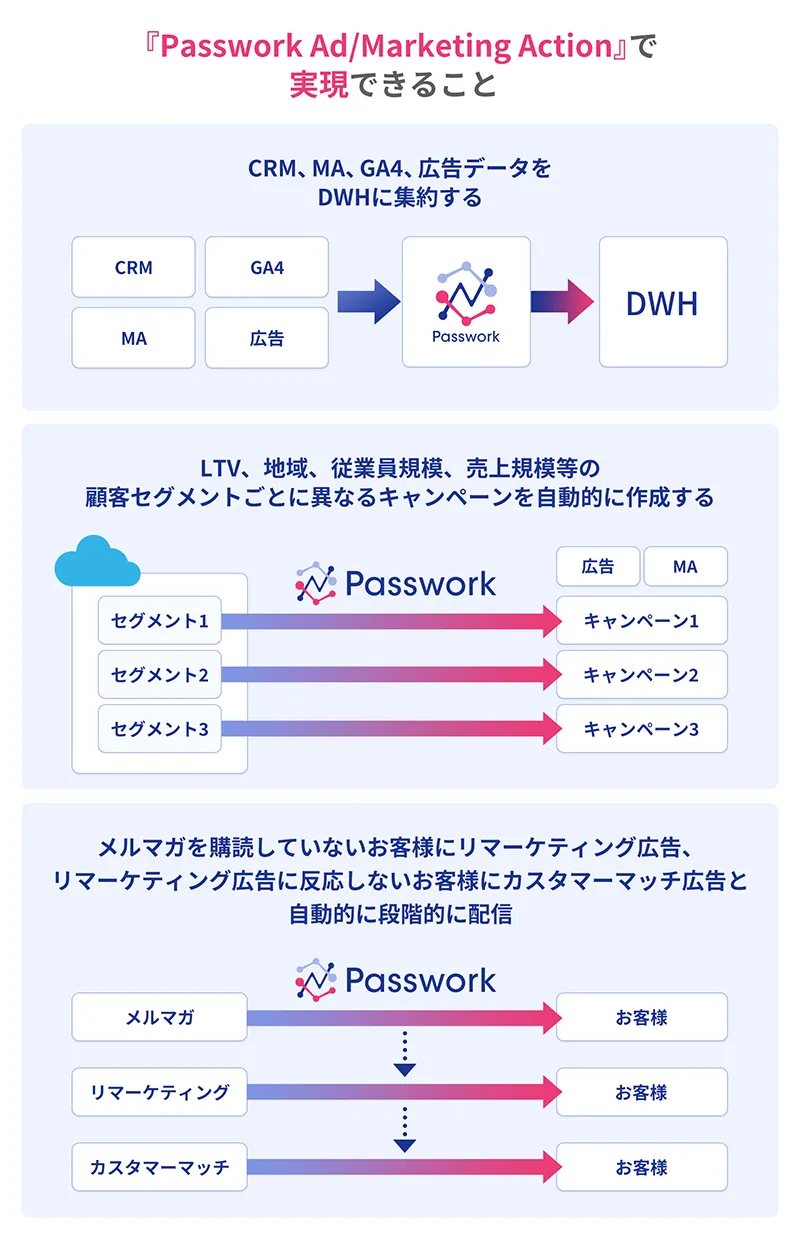 Praztoは、データ統合型広告配信サービス『Passwork Ad/Marketing Action』を提供しており、これにより企業が抱える多様なデータを統合し、効果的なマーケティング施策の展開を可能にしています。具体的には、CRM、MA、GA4、広告データをDWH(データウェアハウス)に集約し、シームレスにメルマガや広告配信を行える仕組みを整えています。