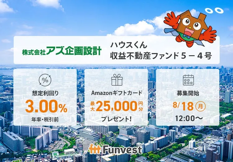 8月18日から、貸付型クラウドファンディング「Funvest」が新しいファンド「アズ企画設計 ハウスくん収益不動産ファンド5-4号」の募集を開始します。本ファンドは、不動産関連事業を展開する株式会社アズ企画設計に対して出資金を貸し付ける内容となっています。