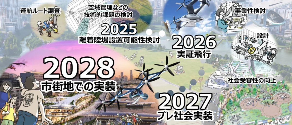 本プロジェクトでは、まずSkyDriveとJobyの2機種の特性を生かした様々なユースケースでの試験を行います。この一環で、東京都内における離着陸場の候補地を調査し、候補地の整備や社会受容性を高めるためのモックアップ展示や公開イベントの開催が計画されています。特に2028年度以降を見据えた地上での実装に向けての準備が進められています。