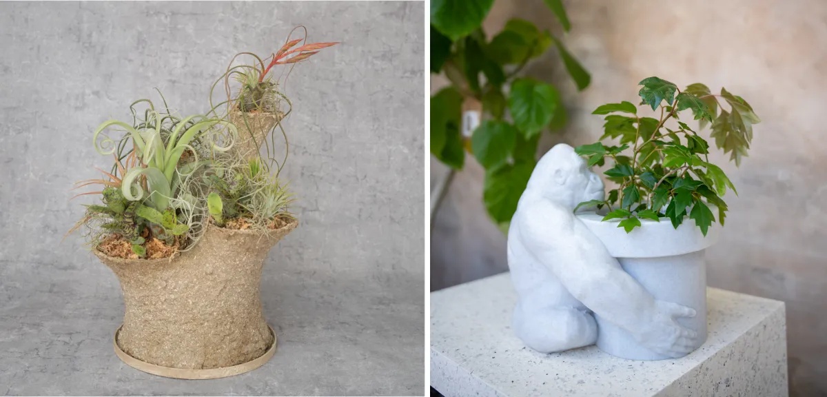 続いて、Dynamite Tが制作した「見守りゴリラ」。こちらは、その名の通りゴリラの形をした鉢で、インテリアにユーモアを加えるアイテムとして人気を博しています。販売価格は3,780円となっています。さらに、服部充紘の「with Antique」は、古い雑貨を取り入れ、3Dプリントを用いた新しい鉢スタイルを提案。こちらは5,490円で購入可能です。
