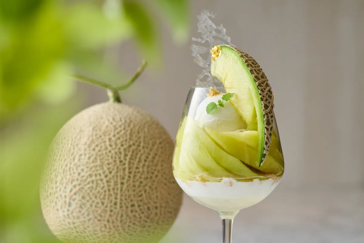 アールスメロンは、くし形にカットされ、グラスの側面に美しくデコレーションされています。そのため、どの角度からもメロンの鮮やかな緑色が楽しめる工夫がされています。さらに、濃厚な酒粕クリームが中央に絞り出され、トップには特製の飴細工が飾られており、見た目にも華やかです。