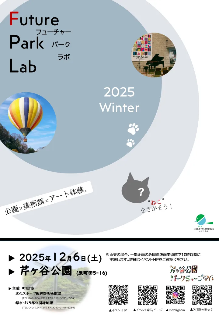 町田市にある芹ヶ谷公園にて、2025年12月6日(土)に開催される「Future Park Lab 2025 Winter」は、地域密着型の市民参加イベントです。このイベントでは、豊かな自然と文化芸術が融合した体験が盛りだくさん!家族みんなで楽しめるワークショップやエンターテイメントが用意されています。