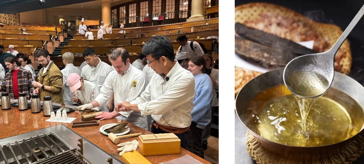 2026年1月には、CIA核となるニューヨーク州ハイドパークのキャンパスで、「だし」をテーマにした講義を行いました。講義では、うま味の基礎知識や科学的背景、かつお節と昆布の製造工程、さらには西洋料理への応用可能性まで幅広く取り扱い、実演や試飲を通じて学生たちに深い理解を促しました。