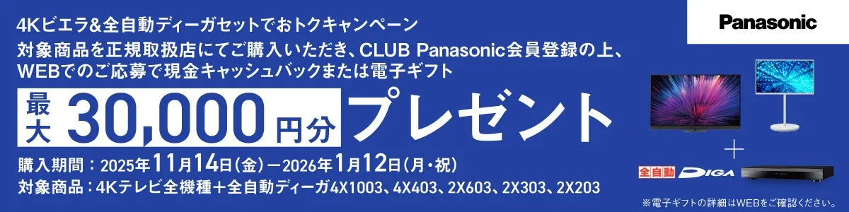 パナソニック株式会社は、2025年11月14日(金)から2026年1月12日(月)までの期間中、特定の4Kテレビおよび全自動ディーガ購入者にキャッシュバックを実施するキャンペーンを発表しました。このキャンペーンは、CLUB Panasonicに登録し、ウェブから応募することが条件です。最大で3万円のキャッシュバックが得られるチャンスです!