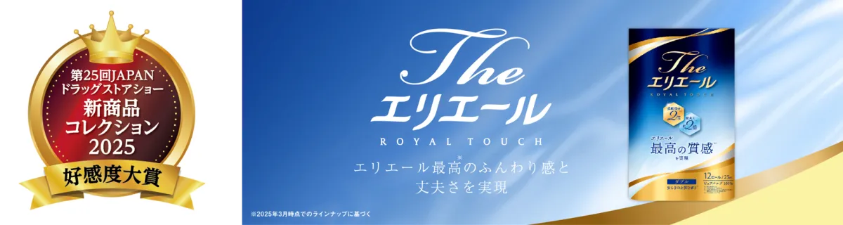 2025年8月に開催される「第25回JAPANドラッグストアショー」で、エリエールの新しいトイレットペーパー『Theエリエール トイレットティシュー』が見事「LIFE部門 好感度大賞」を受賞しました。この賞は来場者の投票によって決まるもので、多くの支持を受けた結果、この名誉ある賞を手にすることができました。
