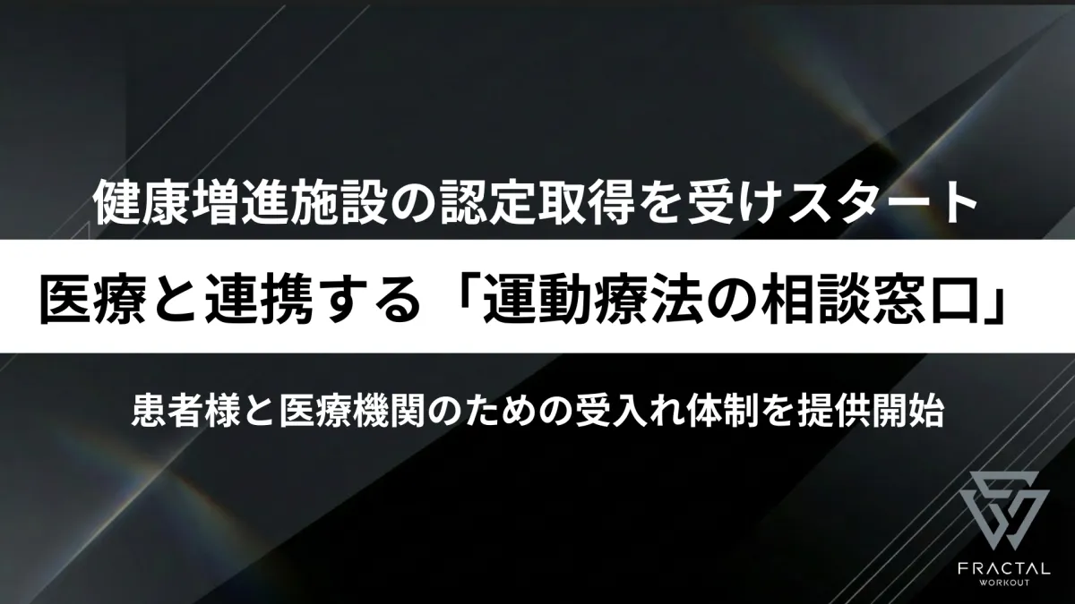 原宿駅前に位置するフラクタルワークアウト株式会社が、健康増進施設として認定を受け、「指定運動療法施設」の申請準備を開始しました。これに伴い、運動療法に関心のある患者様や医療機関向けに「医療連携・運動療法相談窓口」を新たに設けました。
