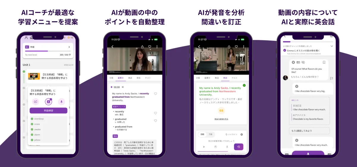 独特な復習方法として、動画内の文を穴埋め形式で出題するディクテーション機能があります。発音については、AIによる採点を受けることができ、ネイティブスピーカーと同じような発音に矯正してくれます。これにより、通常の研修の合間を使って、より効果的な自主学習が可能となります。