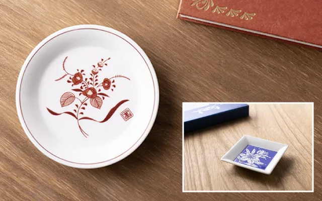 祝電には、「伊万里焼朱慶」が用意されています。上品な色遣いの祝電台紙に、優美な丸皿が組み合わせられており、小皿には白地に赤茶色の花模様が施されています。このお皿は、ハレの日を祝うのにぴったりなデザインで、新たな人生の門出や節目を華やかに彩ります。