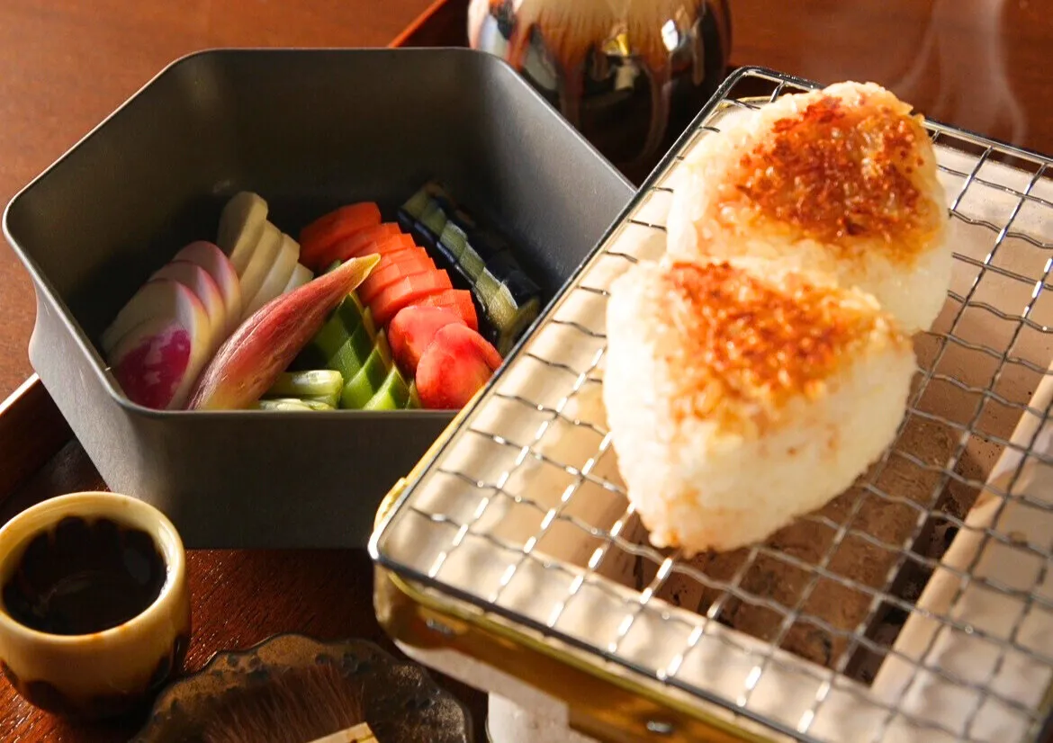「八重乃香」では、来店するお客様一人一人に小さな炭火台が用意され、自分の手で焼きおにぎりを作るという体験が可能です。おにぎりを焼くことで広がる香ばしい香りは、冬の浅草の空気と相まって、特別なひとときを演出します。その焼き上がったおにぎりには、河村屋の看板商品「大福神漬け」の特製タレが塗られ、さらに深い味わいに。約二年半かけて仕込まれたこの秘伝のタレは、発酵ならではの旨味を引き出し、心にも身体にもやさしい一品を生み出します。