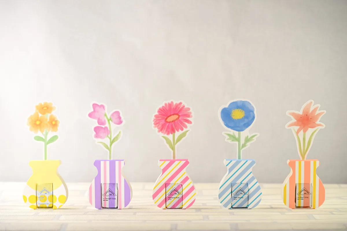 選んだコーヒーに合わせたデザインのフラワーベースに、ペーパーフラワーを挿してお渡しするスタイル。飲み終わった後もフラワーベースとしてお楽しみいただけるため、実用性も兼ね備えています。