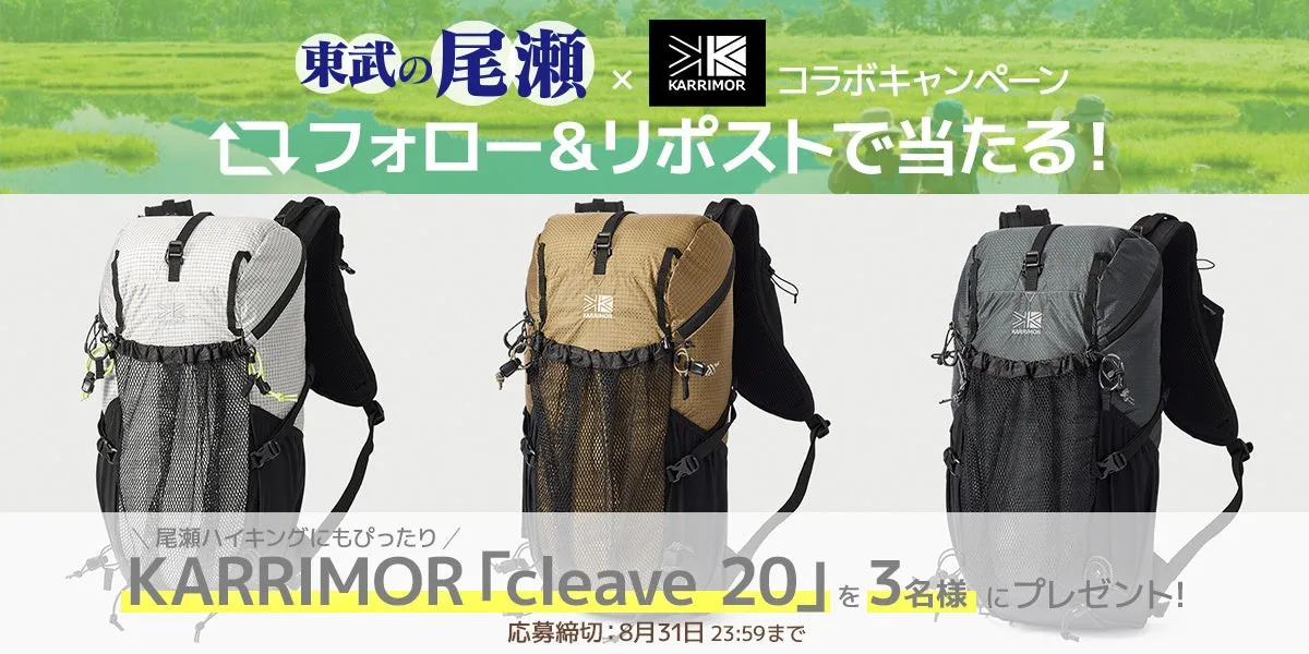 このコラボキャンペーンでは、KARRIMORが提供するアウトドア商品を使用しながら、尾瀬のハイキングを楽しむことができます。さらに、キャンペーンに参加することで、リュックサック「cleave 20」が当たるチャンスも!