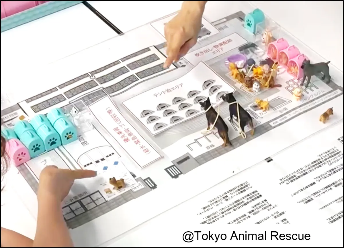 このような状況を考慮し、特定非営利活動法人東京アニマルレスキューは「ペット同行避難図上訓練キット」を開発しました。このキットは、避難所ペットスペースをフィギュアで疑似体験できることを目的としています。具体的には、行政関係者や避難所運営組織、一般のペット飼い主などが参加し、実際の避難時に直面する課題をグループで解決することを目指しています。