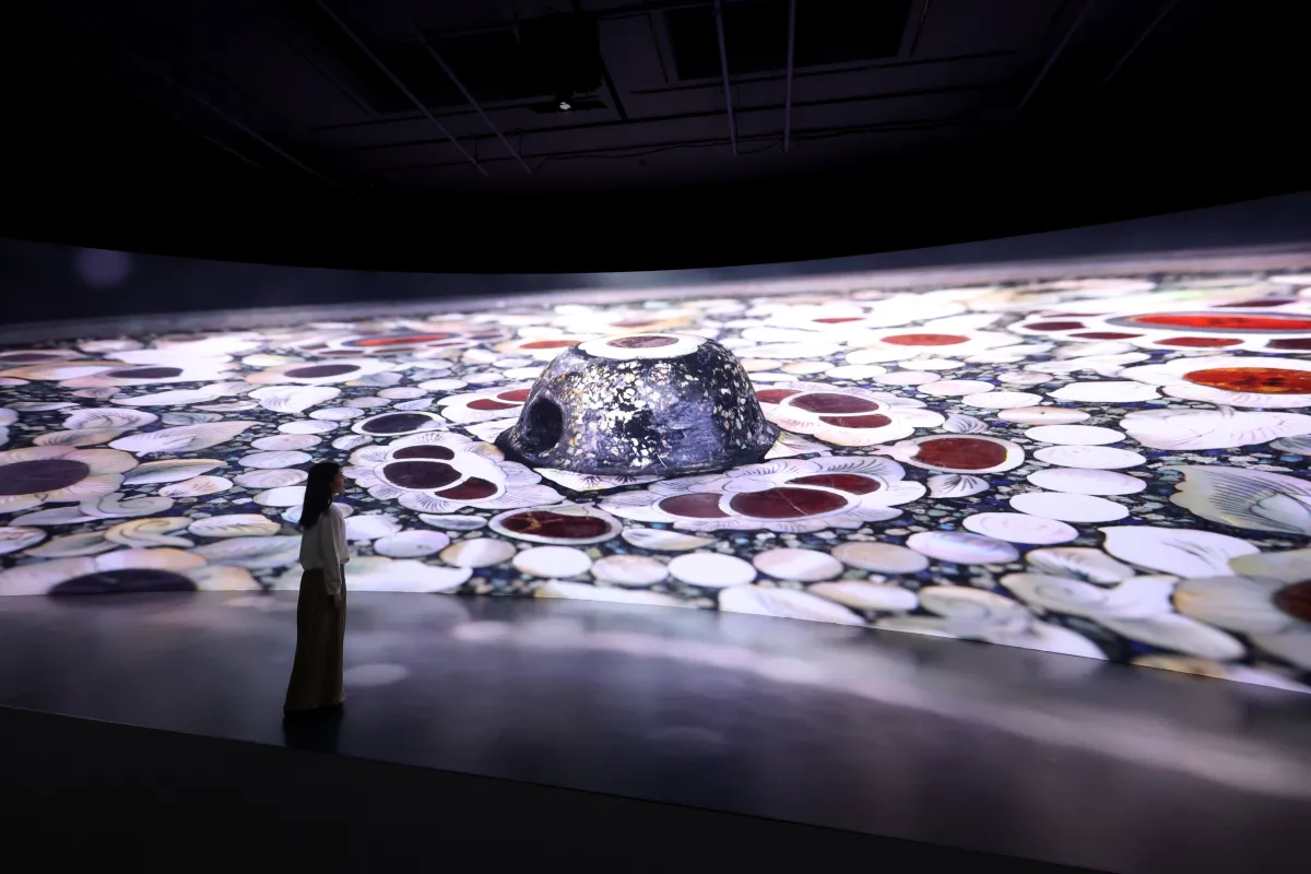 株式会社イマーシブが開発したImmersive Magic Wallは、量子ドット技術をベースにした新しいスクリーン塗料を使用しています。この技術により、従来の投影技術とは異なり、ハイコントラストで色鮮やかな映像表現が可能になりました。この巨大なスクリーンは、幅約20メートル、高さ約4メートルと、その圧倒的なスケール感で、来場者を宝物の美しさの世界に引き込みます。