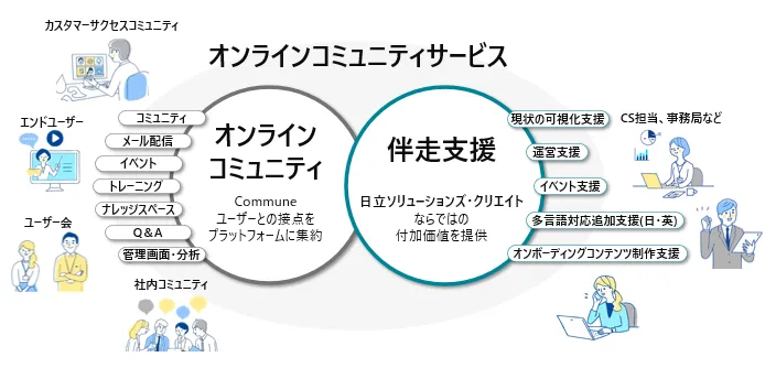 日立は、コミューン株式会社の「Commune」というプラットフォームを活用し、オンラインコミュニティの設立から運営までをサポートします。このサポートは、単なる導入だけにとどまらず、ユーザーに対するわかりやすいコンテンツ作りや、運営の適切さを一貫して提供するものです。このようにすることで、カスタマーエクスペリエンス(CX)を向上させ、顧客の成功を実現しようとしています。