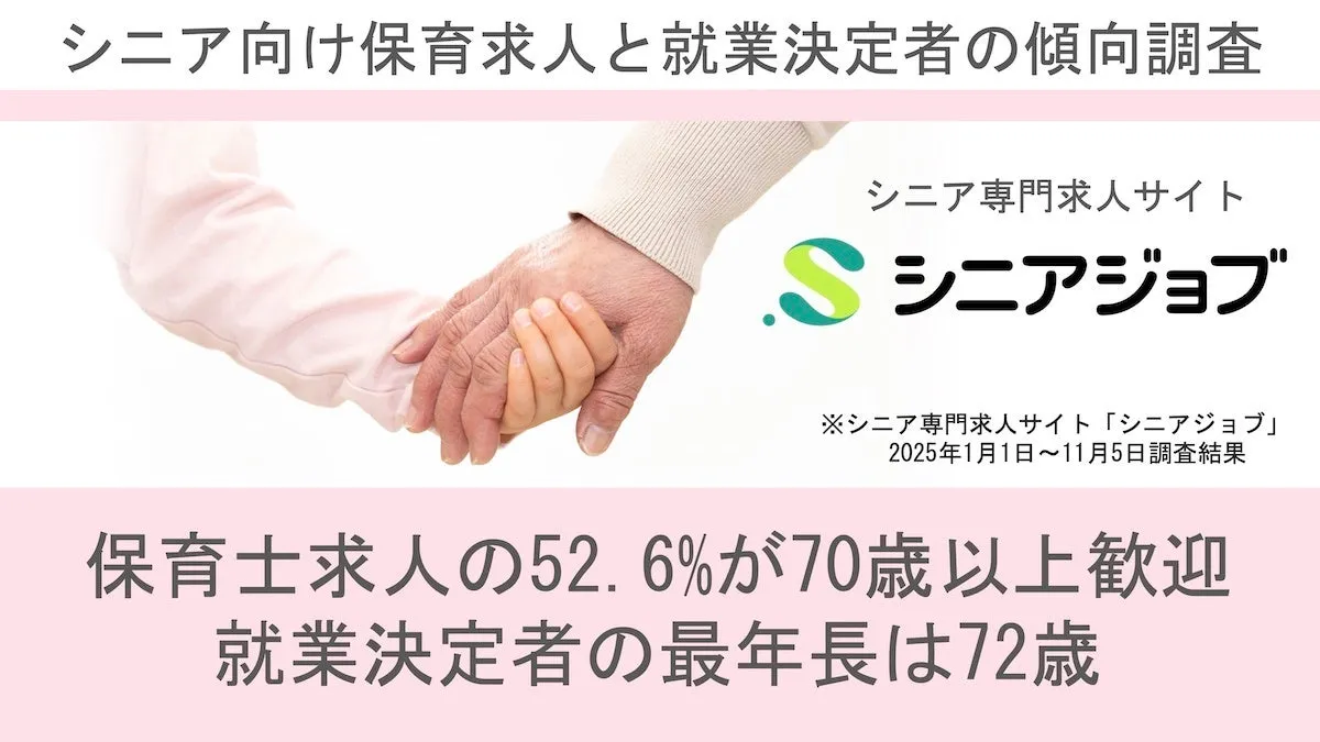 株式会社シニアジョブが運営するシニア専門求人サイト「シニアジョブ」による調査結果では、シニア世代の保育士求人において特筆すべき傾向が見られます。70歳以上を歓迎する求人が52%を超え、最年長の就業決定者は72歳と、高齢者が活躍できる環境が整いつつあります。これによりシニア世代の社会参加が促進され、経験豊かな人材が求められています。