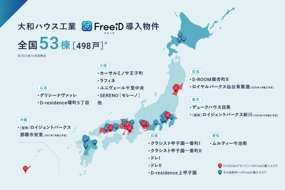 大和ハウス工業は、全国に「D-ROOM」ブランドを展開し、2024年7月には全国50棟以上の賃貸住宅への「FreeiD」導入を達成しています。特に、2026年には「ロイヤルパークス」仙台青葉や「ロイジェントパークス」新川などの物件に「FreeiD」が導入される予定です。これにより、賃貸住宅がスマートシティの一部として進化することが期待されています。