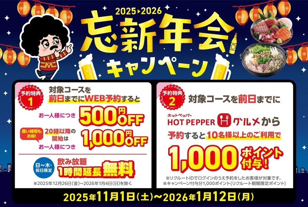 忘年会や新年会を計画している幹事の皆さん、注目のキャンペーンが始まります!株式会社モンテローザが、全国に展開する店舗で「忘新年会キャンペーン」を開催。対象期間は2025年11月1日から2026年1月12日までです。この機会に、特別な飲み会をお得に楽しんでみましょう。