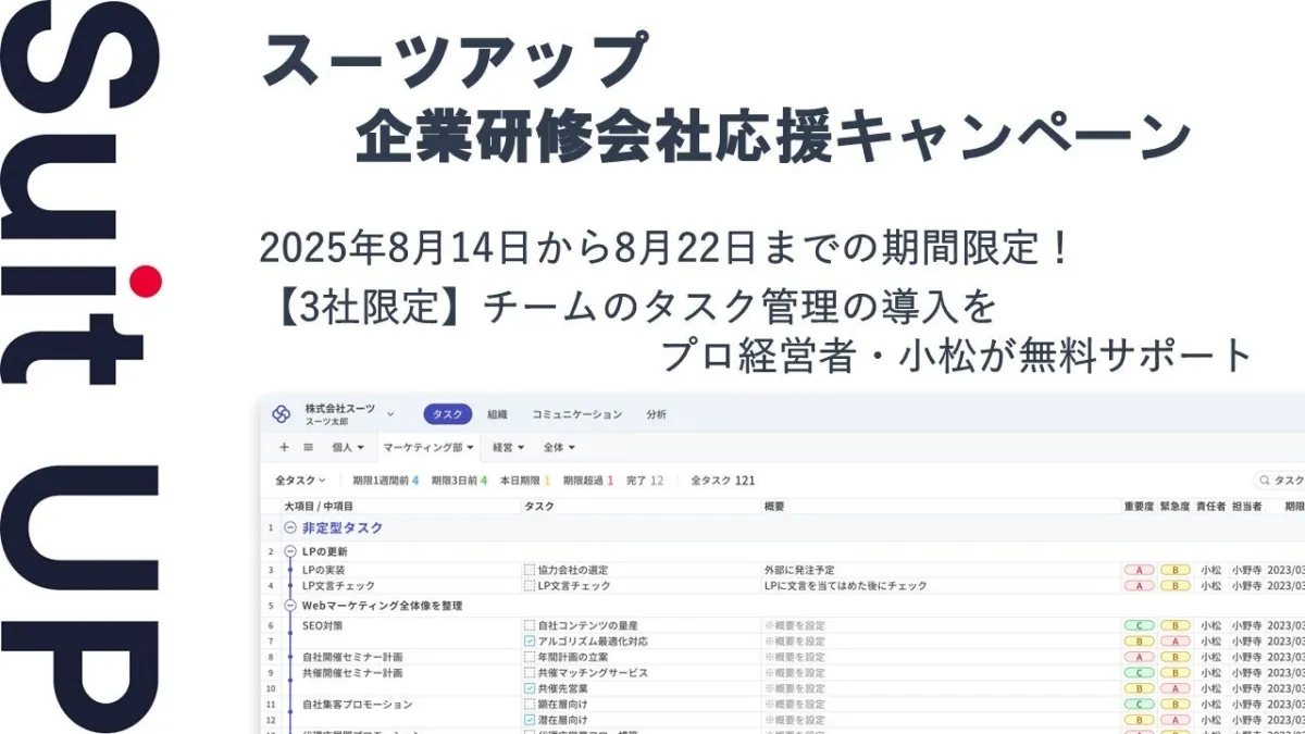 株式会社スーツが提供するチームのタスク管理・プロジェクト管理ツール「スーツアップ」では、企業研修会社向けの応援キャンペーンがスタートします。本キャンペーンは、タスク管理を導入したい企業研修会社を対象としており、特に中小企業やスタートアップのチームが効率的に業務を進める手助けを目的としています。