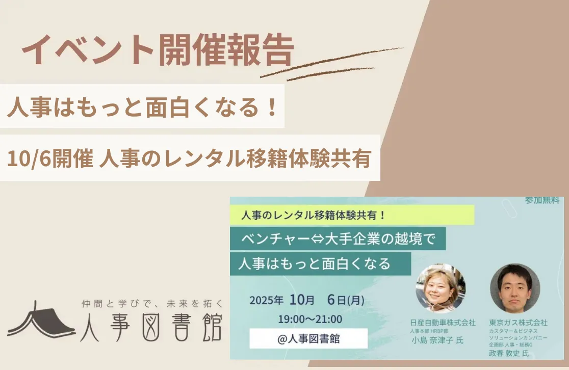 2025年10月6日に東京都中央区の人事図書館にて、「人事のレンタル移籍体験共有!ベンチャー⇔大手企業の越境で人事はもっと面白くなる」と題したイベントが開催されました。このイベントは、人事に関わるさまざまな視点と経験を持つ方々が一堂に会し、越境体験に基づいて意見交換を行う貴重な場として設けられました。