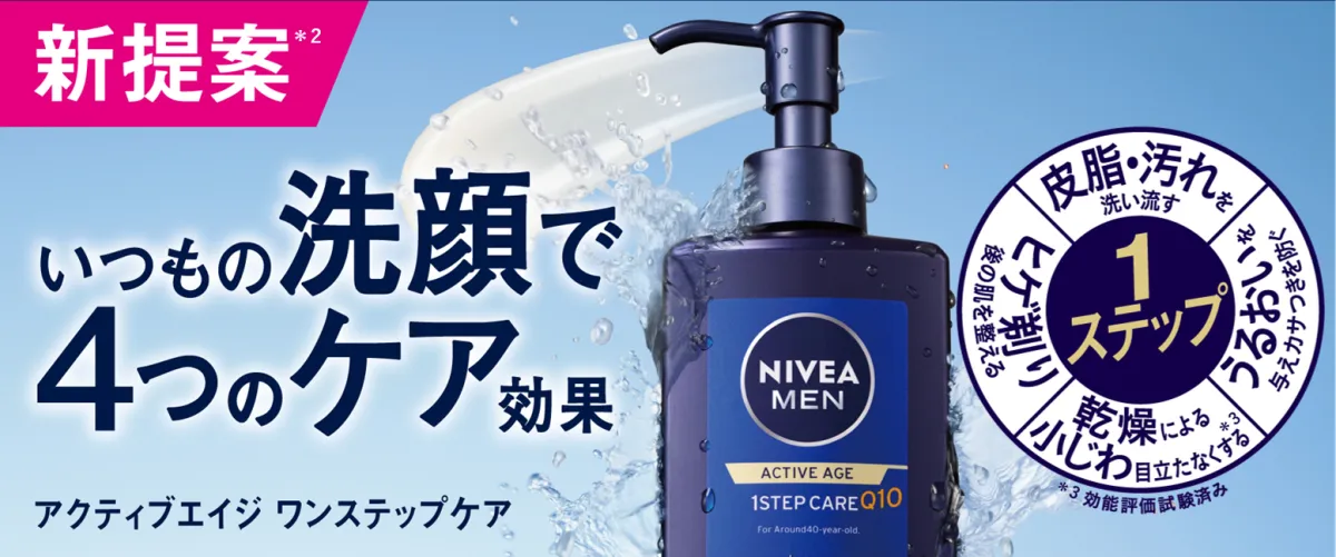 男性のスキンケア市場において、ニベアメンの「アクティブエイジ」シリーズは累計売上No.1を獲得しています。この度の「ワンステップケア」は、その中でも特に、「これからスキンケアを始めたい方」や「年齢とともに変化する肌に対処したい方」にぴったり。日々の忙しい生活の中でも、手軽にお手入れができるのが大きな魅力です。
