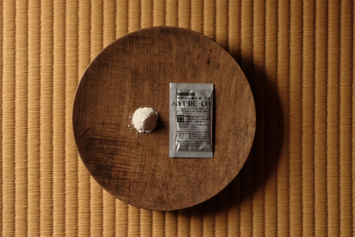 「YUDE-CO」は、乾麺を茹でる際に使うことで、中華めんの特有の風味や食感を楽しむことができる調味料です。アルカリ性の茹で湯と組み合わせることで、麺の色味や触感に変化が生まれます。使用されている材料は、内モンゴルの塩湖から取れるかんすい(炭酸ナトリウム)で、その他の添加物は含まれていません。これにより、自然な風味を保ちながら、毎日の料理に新しいアクセントを加えることができます。