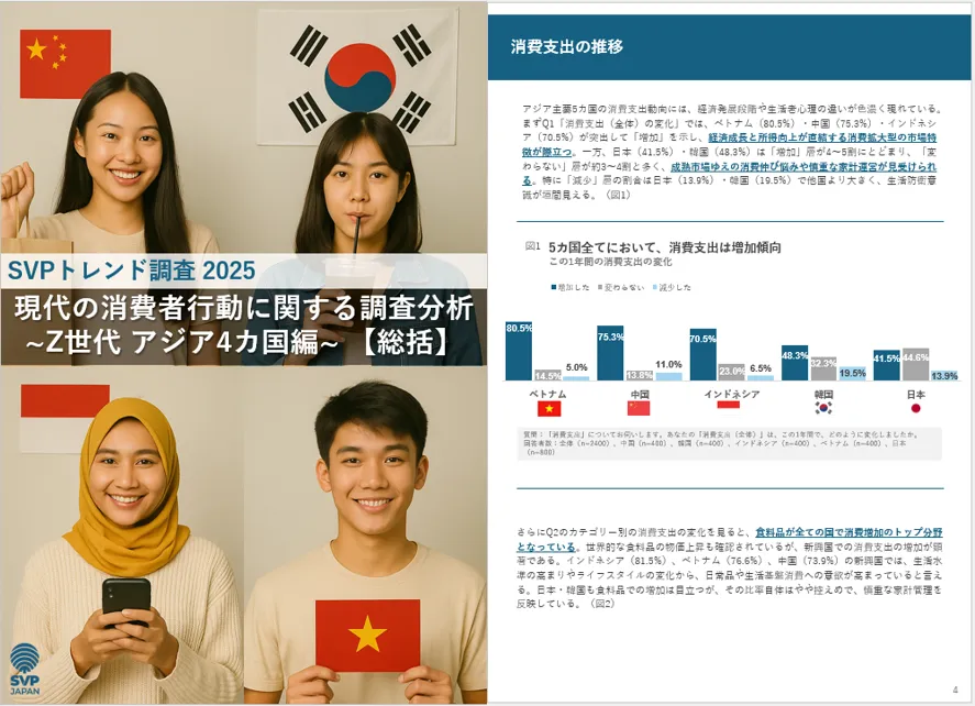 株式会社SVPジャパンが実施した『現代の消費者行動に関する調査分析~Z世代 アジア4カ国編~』では、中国、韓国、インドネシア、ベトナムを対象に、Z世代の消費行動を深く掘り下げました。調査からは、各国の消費傾向や日本のZ世代との違いが浮き彫りとなりました。