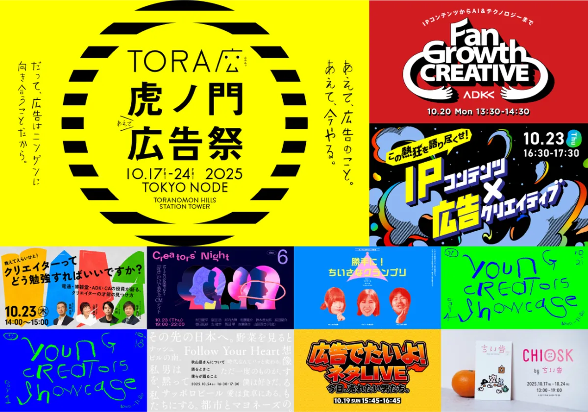 2025年10月17日(金)から24日(金)まで、東京ミッドタウンの虎ノ門ヒルズで開催される【虎ノ門広告祭】に、ADKグループが参加します。この祭りでは、社員15名が9つのセッションで講演を行い、様々なクリエイティブなアイディアを発信する予定です。