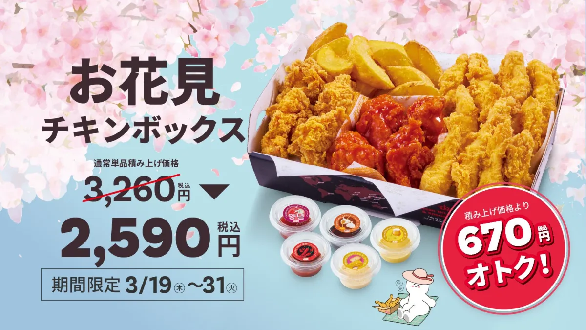 このボックスには、人気の骨なしモモ黄金フライドチキン、芳ばしいヤンニョムチキン、さらにチキンフィンガーとフライドポテトを組み合わせたお得なセレクションが含まれています。また、チキンフィンガーには選べる5種類のディップソースがついており、個々の好みに応じた楽しみ方が可能です。お値段は通常の単品価格から670円少ない2,590円(税込)でのご提供。友人や家族とシェアしながら、お花見を楽しむのに最適な選択です。