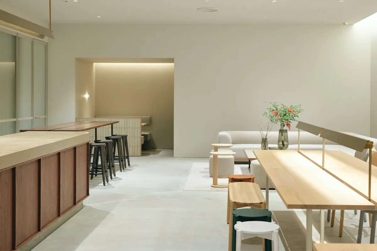 内装はFLUU NKUUが担当し、心地よい居場所を提供するために日差しが差し込むようにデザインされています。シンプルながらも、真鍮の照明やテラゾー、オーク無垢材などの温かみが感じられる素材が使用されています。
