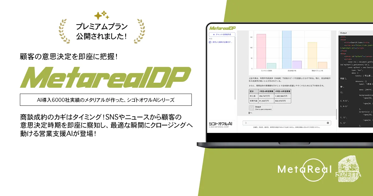 営業現場において、顧客の意思決定の瞬間を逃さないことは、成功の鍵を握ります。しかし、これまでそのタイミングを的確に捉えることは、多くの営業担当者にとって困難でした。そんな問題を解決する新たなAIエージェントが登場しました。それが「Metareal ディシジョンプリディクト」(以下、Metareal DP)です。このサービスを提供するのは、AIソリューションを手掛けるメタリアル・グループの株式会社ロゼッタです。