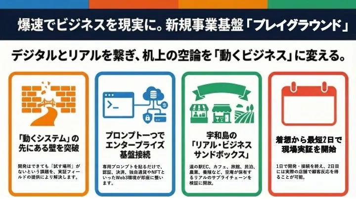 愛媛県宇和島市の株式会社空庵と、東京都千代田区の株式会社JSOLが提携し、「プレイグラウンド」と名付けた超高速新規事業開発プラットフォームの基本合意を2026年2月20日に発表しました。本プラットフォームは、構想から実装・実証までのプロセスを効率化し、新たな地域イノベーションを促進することを目指しています。