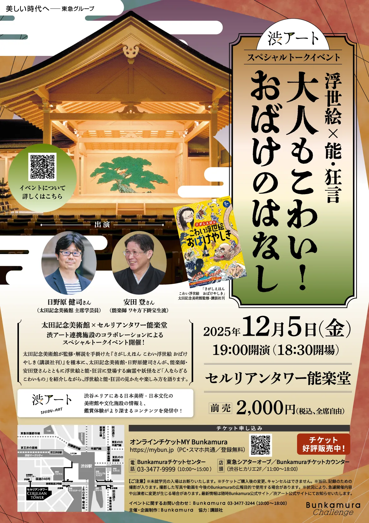 今年12月5日(金)、東京・渋谷にある文化施設Bunkamura内のセルリアンタワー能楽堂にて、特別トークイベント『浮世絵×能・狂言大人もこわい!おばけのはなし』が行われます。このイベントは、太田記念美術館とセルリアンタワー能楽堂のコラボレーションとして実現し、浮世絵や能・狂言に登場する幽霊や妖怪の話を聞くことができる貴重な機会です。