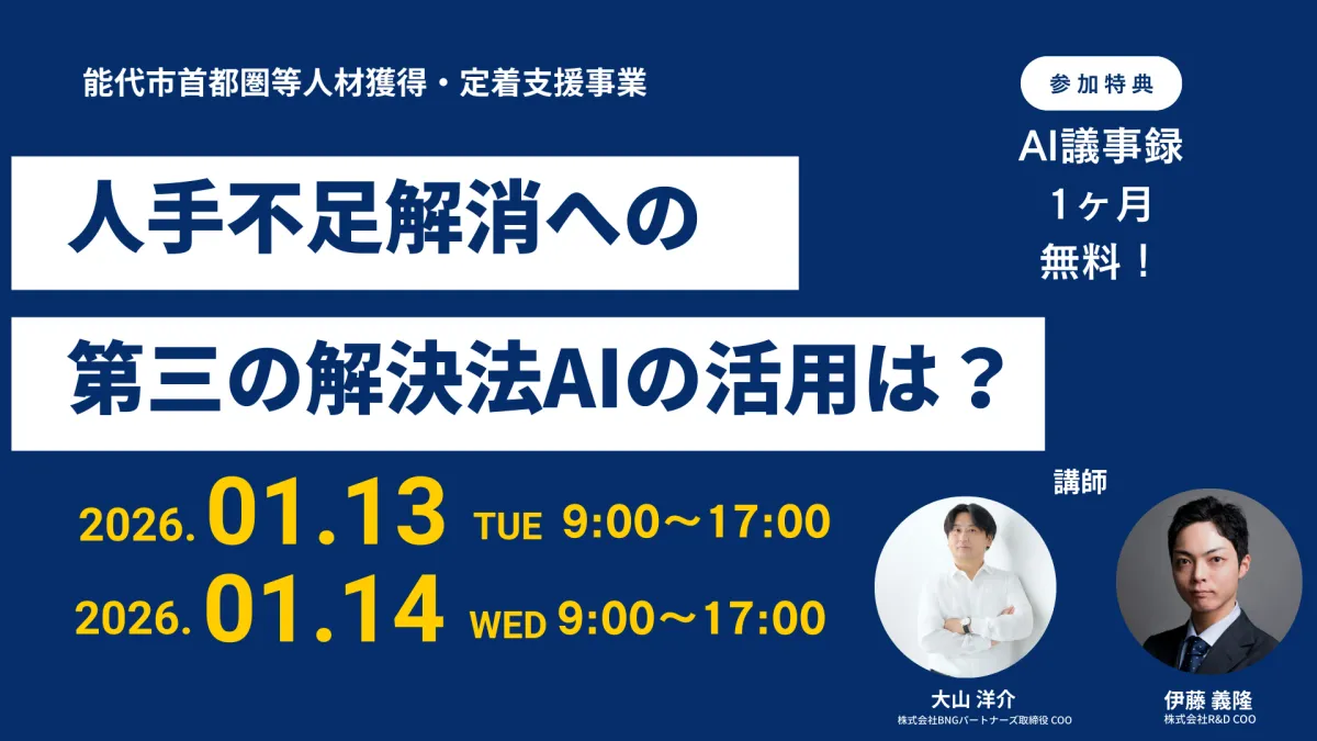 開催日は2026年1月13日(火)、14日(水)の2日間で、能代市役所が会場となります。この相談会は、能代市の「首都圏等人材獲得・定着支援事業」の一環であり、地域の人材の定着と新たな雇用創出を図る取り組みとして位置付けられています。特に、地域事業者が抱える業務課題に対してAIやデジタルトランスフォーメーション(DX)を活用する提案を行うことが目的です。